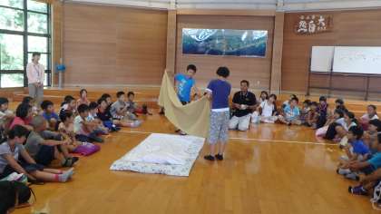 昼食後,プレイホールに集まって,職員さんから寝具準備の仕方を教えていただきました。シーツの敷き方や毛布のたたみ方など,お家とはちがったルールに戸惑いながらも一生懸命説明を聞いていました。これは,来年の花背山の家にもつながりますので,しっかりと覚えておいてほしいものです。さて,寝心地はいかがでしょうか?