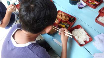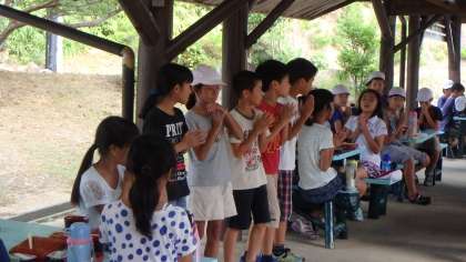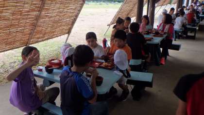 昼食と同じ場所で,夕食もいただきました。今日の夕食は,トンカツ定食です♪おみそ汁とごはんは給食のようにその場で配膳します。デザートにゼリーもついておなかいっぱい!子どもたちはみんな元気です。今,順番に入浴中です。