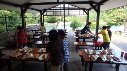 食事係がみんなよりもはやく野外炊事場に集まりました。少しでも早くパックドックができるように,パンを並べたり,牛乳やプリンを配ったりと活動していました。このようにスムーズな活動の裏側には,誰かが準備をしてくれているのだということも伝えたいところです。そう,自分のことだけじゃなく,みんなのために。