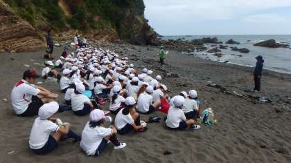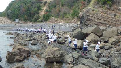 いいお天気です♪さすがに波が高く,水もにごっていますが美しい眺めです。明日,訪れる鳥羽水族館の職員さんが来てくださり,危険な生き物について教えていただいた後,子どもたちといっしょに観察して周ってくださいました。12時56分の干潮にあわせ,「潮だまり」がたくさんできてきました。はたして生き物はゲットできるのでしょうか。みんな Go!