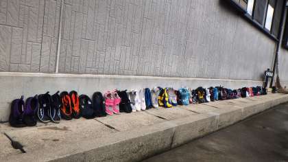 入浴から帰ってきた子どもたちは,空いているスペースを見つけ,次の友だちの干す場所も考えながら,水着とタオル,バスタオルを干しています。また,海で使用したシューズもていねいに洗って砂を落とし,きれいに並べています。「自分のことは 自分で」みさきの家では当然のことです。あれっ?でもこれってお家に帰ってからもできることですよね♪