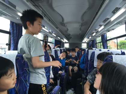 移動時間をどのように使うのかも子どもたち次第です。レクリェーション係が中心になってゲームで盛りあがっているようです。伝言ゲームを楽しんでいるようです。長いバス移動も子どもたちの 子どもたちによる 子どもたちのための時間となり,退屈さを感じさせません。