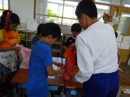 子どもたちは,中学生に風呂敷の使い方を教えてもらい