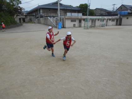 「がんばれ」,「バトンパス上手だね」と,励まし合う声を出しながら,チームワークよく活動できています。
