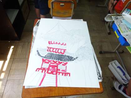 写生会を終えて,今日はいよいよ下書きを完成させ,絵の具で