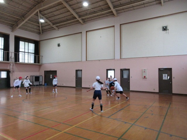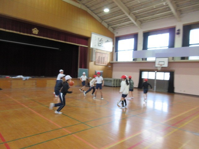 体育の学習では、バスケットボールをしています。攻め、守りの作戦を一生懸命考えて、工夫しながらゲームを進めています。励まし合いながら、良い雰囲気でがんばっています。
