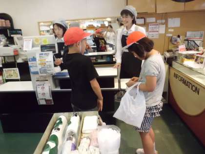 春から育てていたじゃがいもを収穫し,何を作るかみんなで話し合った結果,ポテトサラダを作ることになりました。近くのスーパーにっさんへ材料を買いに出かけました。ホットケーキ作りから2回目の買い物ということで,今日はとても落ち着いて活動していました。たまご,ハム,マヨネーズ,コーンの缶詰をそれぞれ分担して買います。お金は,どのくらいの金額が必要か予想した額を受け取って財布に入れ,エコバックを片手にいざ買い物です。どの材料も多くの種類があり,適切な分量を考えながら選んでいました。レジではスムーズに会計をすませ,必要な額のお金だけを出しているのには感心しました。学校に戻るとお金の精算をしました。おつりの計算は,何算を使うのかな?財布に残っている金額と合っているかな?と友だちと協力して確かめました。さあ,調理実習です。きっとおいしく作れることでしょう。楽しみです。