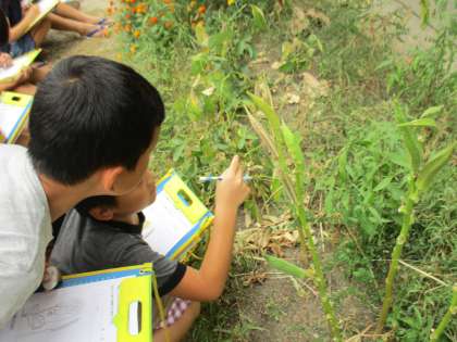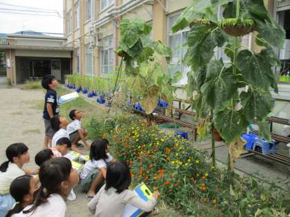 オクラも実が枯れ,中から種が見えていました。「種まきした時の種といっしょや!」「これをまいたら,またオクラができるんか〜!」と言いながら観察していました。