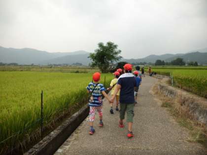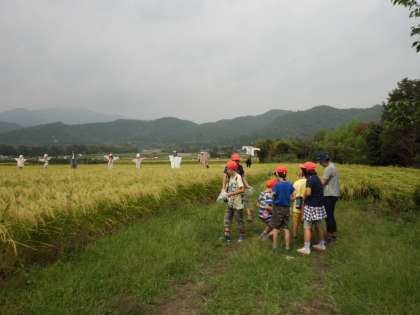次のめあては,かかしさがしです。稲刈りを済ませた田も多く,あまり見つかりません。やっと最後にいつもの一条通り沿いの田んぼにずらっと並んでいました。ドラえもんやミニオンズのかかしを見つけ大喜びでした。