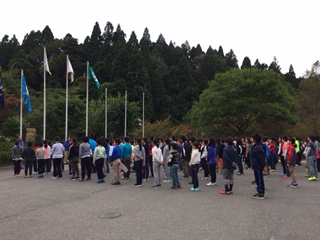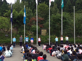 桂坂小学校、第三錦林小学校、広沢小学校三校が本館前で朝の集いをしています。