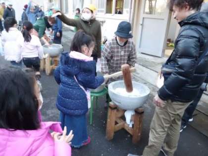 「もちつき大会」は,各種団体の方にお世話になり,子どもたちもお餅をつき,丸めました。高学年児童の中には,「御幣餅」を作るお手伝いをした人もありました。ついたお餅はすまし雑煮やおぜんざいにしていただきました。