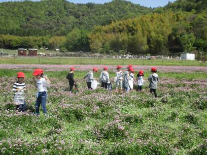 広沢池の近くの畑までれんげ摘みに行きました。たくさんのれんげに,みんな足を踏み入れるのに初めは緊張していました。