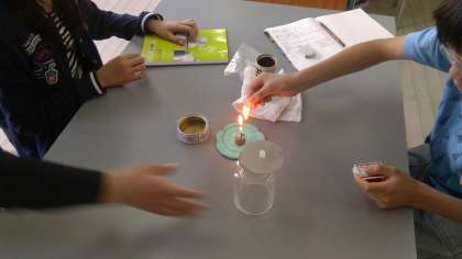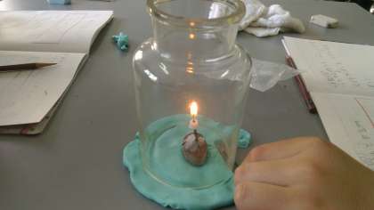 ビンの中で物が燃え続けるためにはどのようにすればよいかを予想し,実験に取り組みました。物の燃え方や線香の煙の動きがよく分かりました。