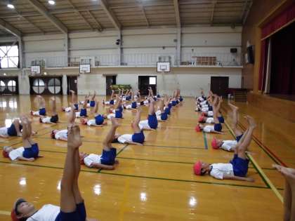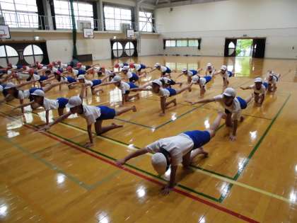 今日の体育の学習は,運動会に向けて団体演技の練習をしました。手を地面に対して平行に上げたり,足を地面に対して垂直に上げたりと基本の技を行いました。これから人数を増やし,みんなで技を作り上げていけたらと思います。6年生53人頑張ろう!!