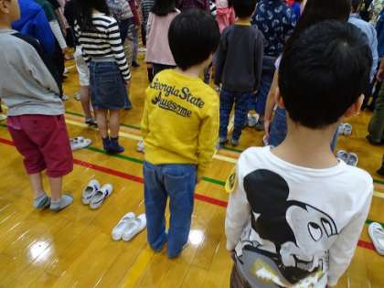 4月24日(火),はだし開きをしました。1年生にとっては,初めてのはだしでの生活がスタートしました。はだし開き集会をした後,教室に帰り,すあし・はだしの生活でがんばりたいことを考えたり,すあし・はだしで過ごすときの約束を確認したりしました。
