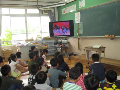 その後,どんな演技をするのか,ビデオを見ました。食い入るように見ているみんなの目は,意欲にあふれていました。