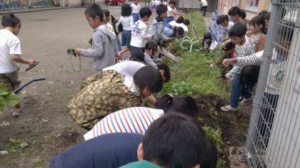 今日の中間休みに,中庭の畑の草抜きをしました。