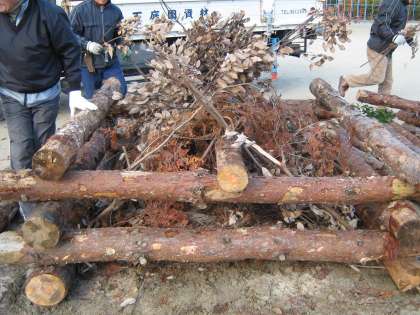 今日は地域の方々がどんど焼の準備をして下さいました。大変手際よく、次々と丸太を井形に組んでいき、立派な壇木ができあがりました。