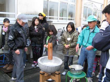 1月8日(土)、地域の文化交流センター始め、地域の方々やPTAの方々のお世話で、『もちつき・どんと焼き』が行われました。