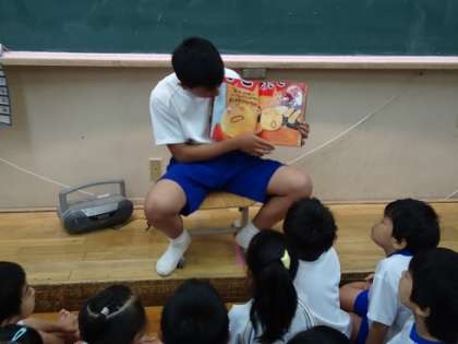 子どもたちは,お兄さんの読み聞かせを一生懸命聞いていました。お話も面白かったようで,子どもたちは,とても喜んでいました。