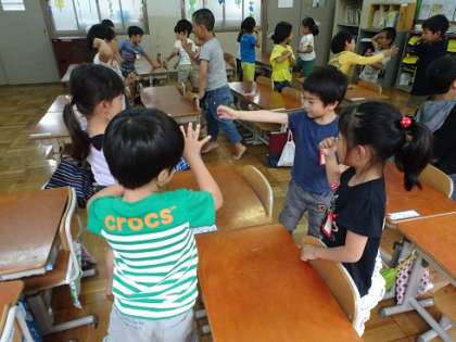 みんなで,歌詞に合わせて体を動かしたり,拍に合わせて体を動かしたりしながら楽しく歌を歌いました。もちろん,子どもたちは,歌の終わりのじゃんけんをとても楽しんでいました。いろいろな友だちとじゃんけんをしながら,何度も何度も歌ったりじゃんけんをしたりしました。