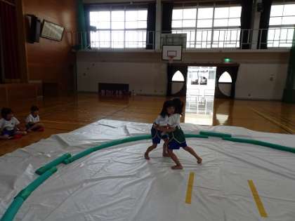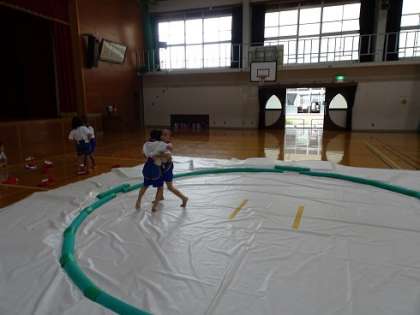 全員すもうパンツが履けた後,すもうのルールに従って,取組を行ってみました。全ての子どもたちが2回ずつ取組をしました。1回目は,「すもう」がどんなものかあまりわかっていなかったようで,戸惑いの多い取組になっていました。2回目の取組になると,1回目とは打って変わって,勝負を意識した白熱した取組になっていました。応援の声も大きくなっていました。子どもたちに初めてのすもうあそびの感想を聞くと,「楽しかった!」と言っている子がほとんどでした。