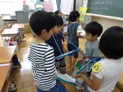 教室でインタビューの仕方の最終確認をし,いざ先生の待つ教室へ出発!!好きな食べ物を聞いたり,好きな形を聞いたり・・・。いろいろな先生方の好きなものを中心にインタビューをしました。たくさんお話を聞けた子どもたちは,大満足!最後になかよしの証で握手をしてもらって,みんなにこにこ笑顔で教室に帰ってきました。