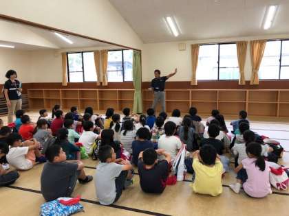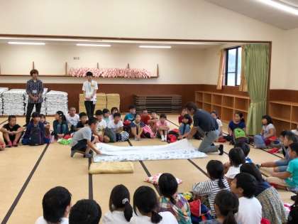 オリエンテーションでは所員の方からお風呂やトイレの使い方,寝具の準備やシーツの扱い方などの話を聞きました。代表の児童が教えていただいたことのおさらいをしています。シーツは1人ではたたむことができません。いかに友だちと協力するか,みんなの気持ちの見せ所です。