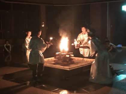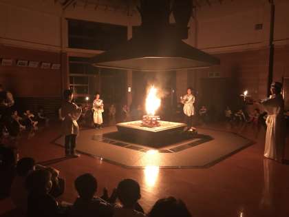 雨は降っていませんが,プレイホールでキャンプファイヤーです。各クラスの出し物やみんなで踊る「マイムマイム」。楽しいひと時を過ごしました。