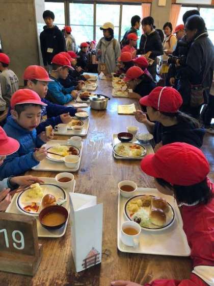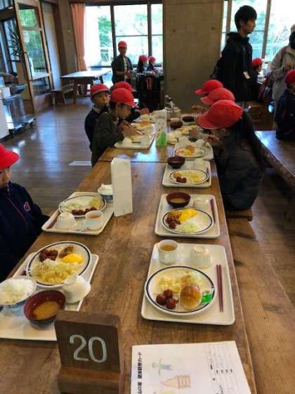 朝の集いの後は,朝食です。花背山の家の食堂での食事はこれが初めて。バイキングカウンターから,自分でおかずを選びます。班のみんなが揃ったら「いただきます。」しっかり食べて,今日も元気に活動しましょう。