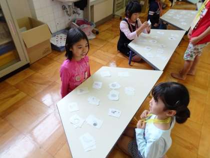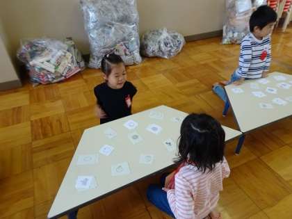 今まで学習したことを使ってフルーツショップでお買い物。好きな果物をたくさん集めて,オリジナルフルーツバスケットを作りました。たくさんの果物が集まって子どもたちは大喜び。「全部の果物が集まった!」「ぼくは,ピーチだけ集めた!」など,思い思いのものができたようです。笑顔で話したり,相手の目を見たり,コミュニケーションのポイントもきちんと学習できたようでした。