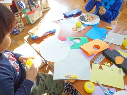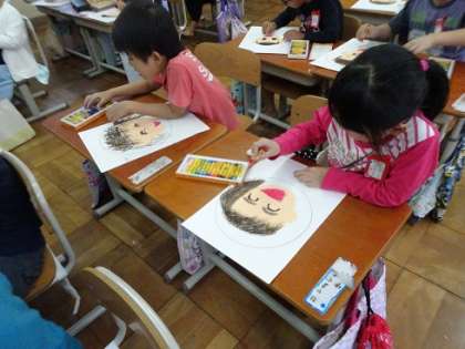 まず,自分の顔を描き,その周りに画用紙で花びらを作って貼り付けました。自分の顔を描く際には,輪郭を手で触って確認したり,耳の形を確認したりしながら,ゆっくり描いていきました。しっかりとクレパスで塗り込むこともでき,子どもたちは丁寧に描けたことに満足している様子でした。