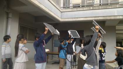 そして,3つのグループに分かれて自転車での発電と,太陽光での発電の発電量を競い合いました。
