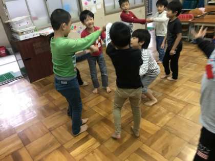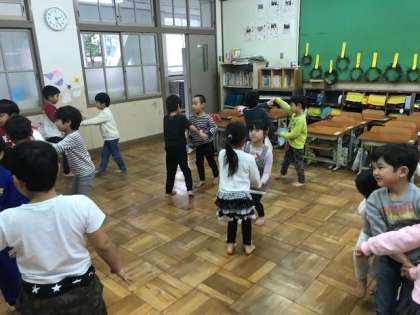 曲想に合わせて体を動かしながら,ねこたちの様子を思い浮かべています。「最初は,ゆっくりだから,横に揺れよう」「途中で早くなるから,元気にとびはねよう」「最後もまたゆっくりだから,ゆったり回ろう」そんなことを考えながら子どもたちは,音楽を鑑賞しました。