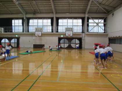 体育科「まねっこあそび」では,体育館にある用具を使ってみんなでまねっこ遊びをしています。9日(金)は,前の人を見ながら低い跳び箱の上でポーズを決めたり,マットの上で動き方をまねたりして活動しました。いろいろな動きをみんなで考えて,楽しんで活動することができました。