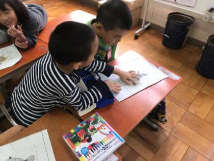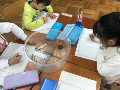子どもたちは,学校で飼っている「カメ」の文章を書くことにしました。まずは,カメの観察・・・。カメを驚かせないようにしながら,よ〜く観察をしました。「つめがある!」「首が伸びるところに,線がある!」「こうらの模様は,こんなんやったんや!!」そんなことを言いながら,観察をしました。メモが完成したあとは,友だち同士で見合いっこ。書き漏れがないか確認し合いました。
