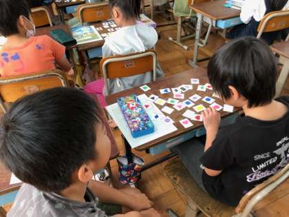 外国語活動で色や形の表し方を学習しました。欲しいカードの形と色を合わせて,”Pink heart please.”などの表現で,カードの交換ゲームをして楽しみました。