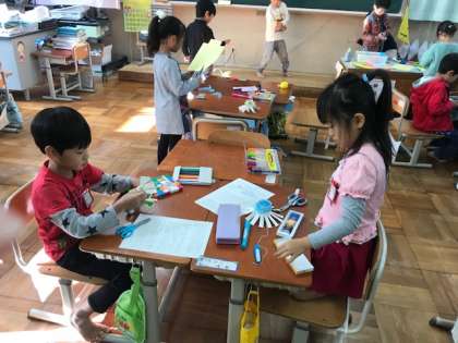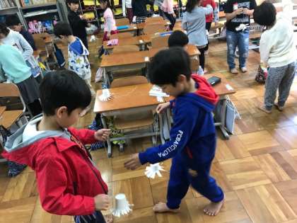 紙コップに穴を空け,タコ糸にクリップをつけたものを通して,くるくる回る仕組みの完成!子どもたちは,紙コップをくるくるくるくる・・・たくさん回して遊びました。その後,もっと楽しい作品になるように,いろいろな飾りつけをしました。色画用紙を付けたり,テープをつけたり,ペンで色を塗ったり・・・。回る様子を試しながら取り組みました。