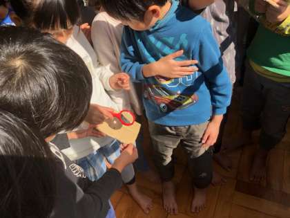 先日,教室に強い光が差し込んだ時に,今なら光を集められるということで,急遽実験を開始しました。段ボールから煙が出て焦げ始めると,子どもたちは「うわー!煙やー!!!」「焦げてるで!」と大騒ぎ。「太陽の光で燃やせるって,太陽すごいなぁ」と言っていました。