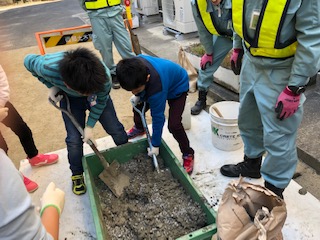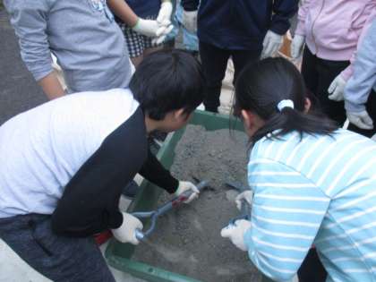 初めての経験だった子も多く,「砂と小石を混ぜるの?」「うわあ,セメントをなでるのおもしろい!」と興味津々で,最後まで楽しんで取り組んでいました。