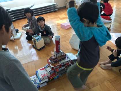 いよいよ図工の時間が始まると,子どもたちは箱を積んだり並べたり。いろいろなことをして楽しみました。時間が経つにつれ,「もっと高く積みたい!」「意外と並べるのは難しいな・・・」様々な感想が聞かれました。