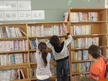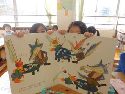 はじめは恒例の大型絵本の読み聞かせから始まります。「友だちや」というお話を通して,「友だちって大事やなぁ」「友だちと本よもぉ」とつぶやきながら,新たな本との出合いに向かいました。