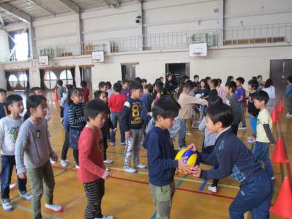 21日(金),今日は2学期最終日でした。2時間目は,2年生全員で体育館で遊びました。ドッジボールでは,ボールを2つ使って1組対2組で遊びました。「頑張るぞー!」と意気込む子どもたちでした。次は,2クラスが混じったチームでボール送りゲームをしました。声をかけ合いながら,協力して遊ぶことができました。