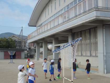 11日 体育科で「パスゲーム(2)」をやりました。「パス・パス・シュート」とという声が響く中,空を眺めて,「今日も晴れやなぁ」とつぶやいていました。