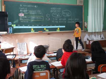 5日(火),算数科「10000までの数」では,数の直線を使い,1000を超える数の大きさについて考えました。黒板に張った「でかでか直線」をつかって,子どもたちは1目盛りがいくつを表しているか考えたり,10000を示す目盛りがどのあたりにあるかを予想したりしました。「1目盛りがわかったら,考えるのか簡単になったよ。」「直線で考えたら,数の大きさがわかったよ。」と振り返っていました。