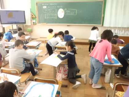 子どもたちは,図工と聞くと大喜び!どんな作品を作っていくのかとても楽しみな様子でした。今回作ったのは,「ひみつのたまご」。たまごからどんなものが生まれてきたら楽しいのか考えながらオリジナルのたまごを考えました。クレパスでしっかり塗り込んだり,コンテでぼかしたり・・・「手が汚くなった!」と言いながら,子どもたちはとても楽しそうでした。