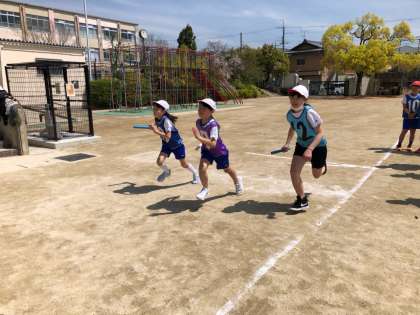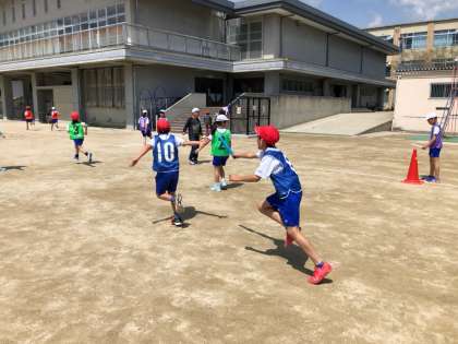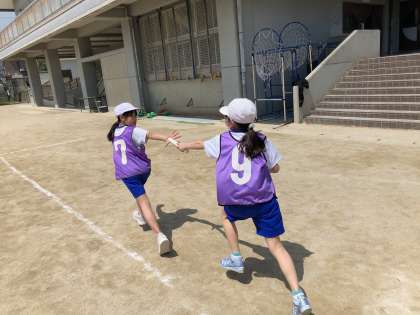 今日から始まったリレーの学習でもバトンパスに重点をおいて練習しています。日本チームの「アンダーハンドパス」とは違い,小学校の体育科では,「オーバーハンドパス」をします。学習カードに書かれているポイントや担任,友だちの助言をもとにチームで協力して記録を伸ばしていきます。
