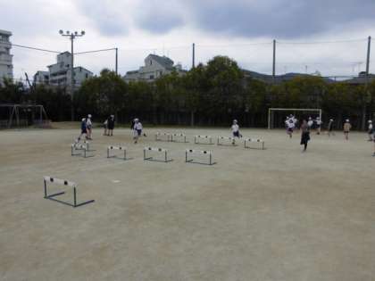 3歩でハードルをこえたり頭の位置がずれたりしないように,2人組で話し合いながら学習を進めました。