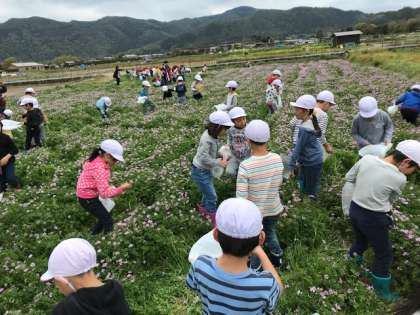 朝から子どもたちは,れんげ摘みを楽しみにしていたようです。健康観察でも「れんげ摘みが楽しみです!」そんなことを言っていました。2年生は,去年は雨で参加することができなかったので,初めてのれんげ摘み。