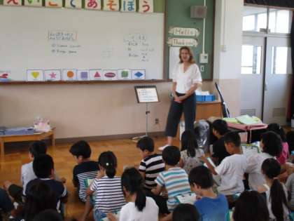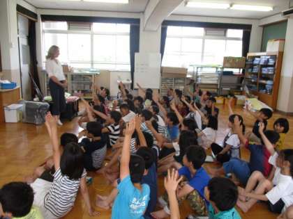 初めて出会う先生にみんな興味津々!一生懸命英語での自己紹介を聞いていました。そのあとはSimon Saysゲームやビンゴゲーム,フェイントゲームをしました。